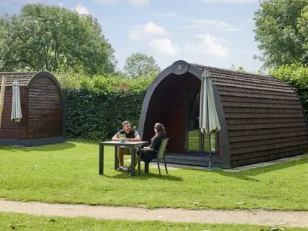 Die 2-Personen-Version verfügt über ein Doppelbett (1 Matratze, Breite 140cm X Länge 200cm). Es gibt eine Toilette, so dass Sie im Toilettengebäude nur duschen müssen. Die Kochnische ist mit einem Herd, Senseo und Kühlschrank ausgestattet, und vom Sofa aus können Sie abends entspannt Ihre Lieblingsfernsehsendungen ansehen. Und wenn Sie die Abendsonne genießen wollen, dann sind die Gartenmöbel sehr praktisch.