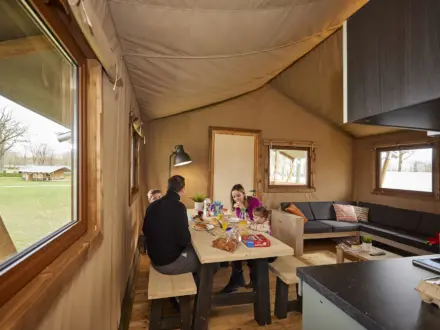 Dank des Elternschlafzimmers mit einem Doppelbett (2 getrennte Matratzen) und eines separaten Schlafzimmers mit einem Etagenbett und einem Einzelbett ist das Glampingzelt Superior ideal für Familien mit Kindern.