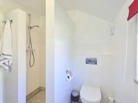 Die vier Schlafzimmer verteilen sich auf das Erd- und Obergeschoss. Das erste Schlafzimmer im Erdgeschoss hat ein Doppelbett mit Einzelmatratzen und das zweite Schlafzimmer hat zwei Einzelbetten. Das erste Schlafzimmer im Obergeschoss hat ein Doppelbett mit Einzelmatratzen und einem Einzelbett und das letzte Zimmer ist mit zwei Einzelbetten ausgestattet. Ein Badezimmer hat eine Dusche, das andere auch ein Badewanne.